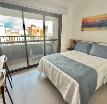 O Studio é um espaço moderno com 27m², cama de casal, totalmente decorado e equipado c/eletrodomésticos novos, cortinas black-out...